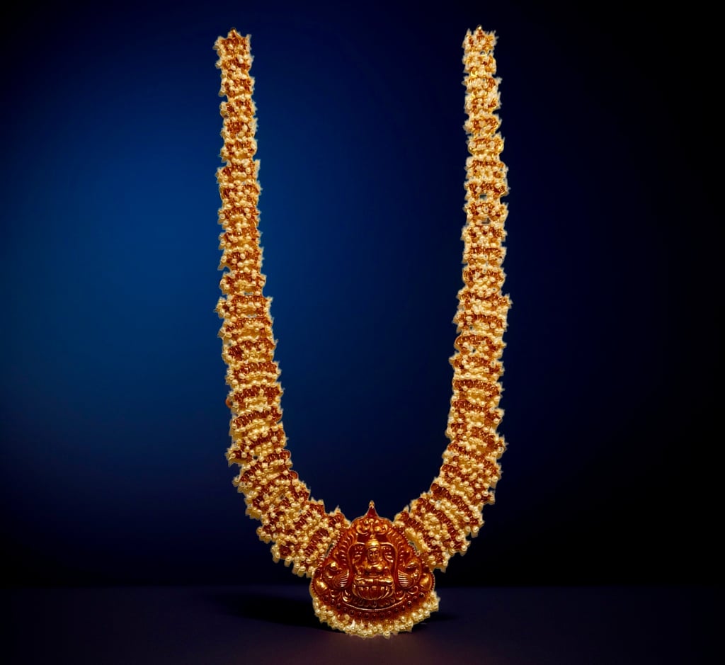 Suspended from this celestial medallion are cascades—braided rivers of seed pearls, each one whispering its own tide-tale. These are not machine-spun pearls but hand-strung orbs, selected one by one, their milky luminescence recalling the foam-fringed edges of waves returning from prayer. It is no coincidence that pearls have long been the metaphors of wisdom, purity, and the hidden treasures of the inner self. Here, they are strung not in symmetry, but in sacred rhythm—echoing the garlands (maalai) draped across temple idols during festivals of light and longing.