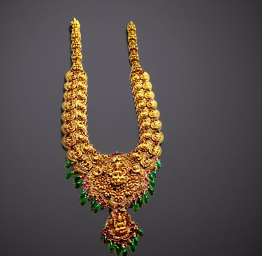 In the veiled hours before empires awoke—when the scent of sacred smoke curled through the air and lamps flickered like whispers in temple sanctums—there emerged from the heart of ancient Bharat a language of divine adornment. The Lakshmi Élan is born of that language. Not a necklace, but a regalia of remembrance, this masterpiece by Ratna Veda bridges the mythic and the material, the sacred and the sovereign.
