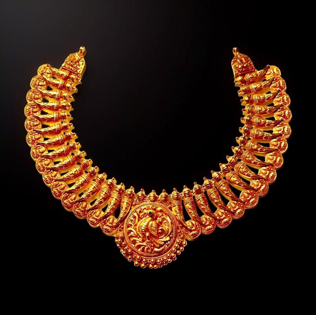 A torque of heritage and courage, The Maratha Plume by Ratna Veda merges Maratha warrior insignias with sculpted 22K gold artistry—an heirloom for modern patrons of power and culture.